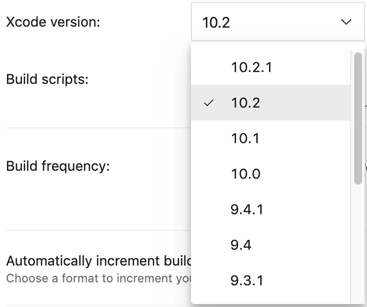 You can configure the XCode version to be used for the build. This is very useful when you are using external libraries that do not work with newer XCode versions. For instance, the Fiori libraries included in my project were not released for 10.2.1 and the newer Swift version that comes with it. Therefore, the build exited with an error. Until SAP released an updated version of Fiori for iOS, I had to use XCode 10.2.