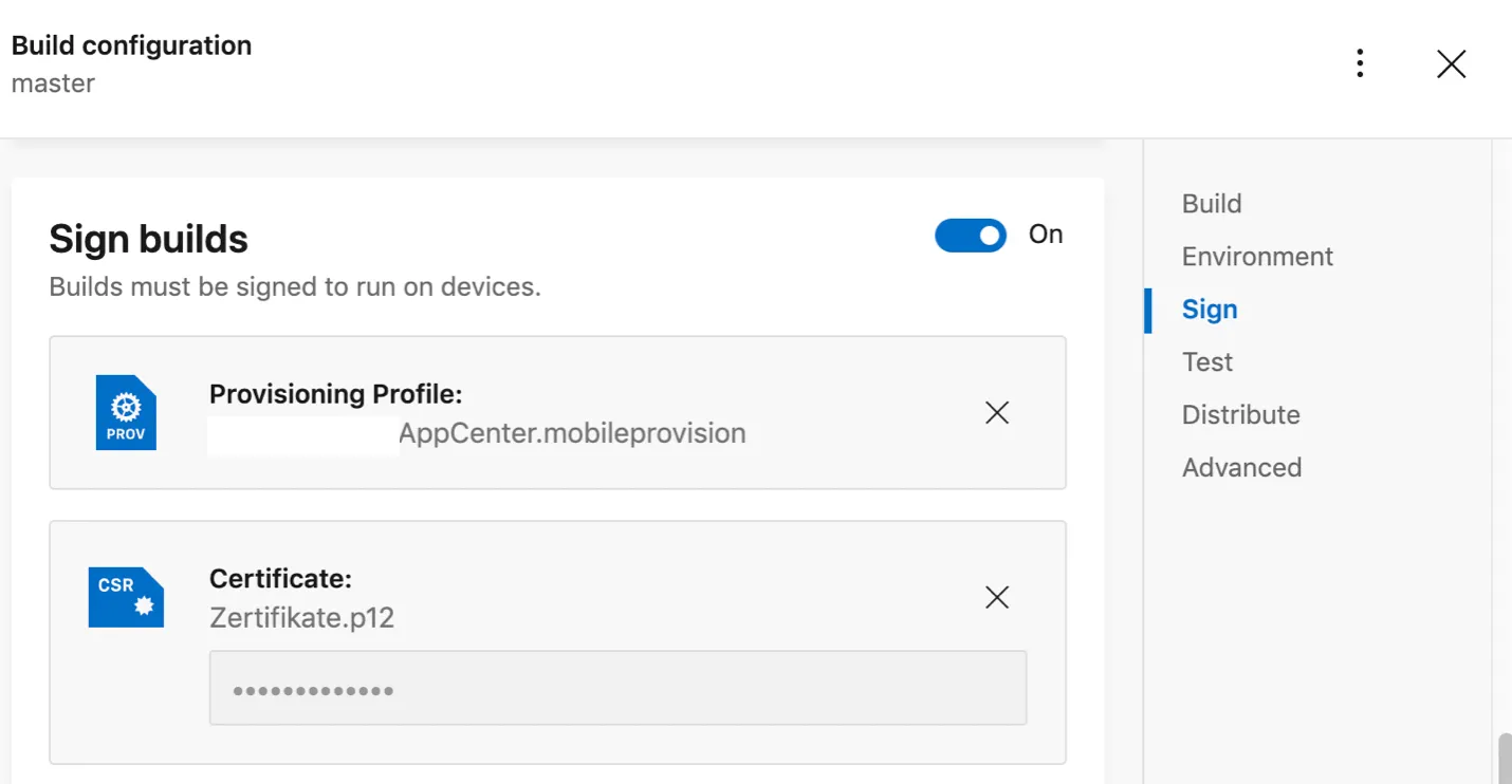 When you have these available, you can start configuring the app signing. You upload the files and provide needed credentials for your private key.