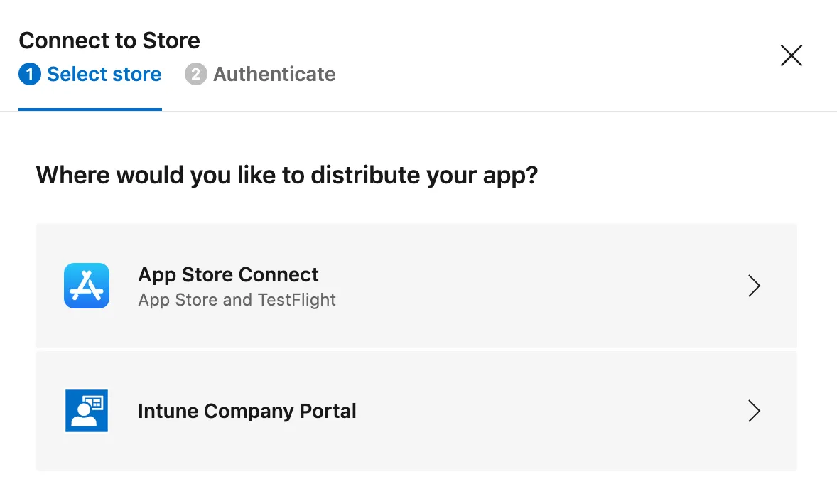Next step is to define where you want to distribute the app to. You can send it to the official App Store, App Store Connect Users for your TestFlight beta testers, or to an internal Company Portal.