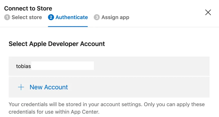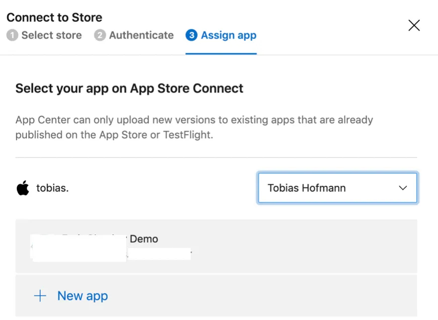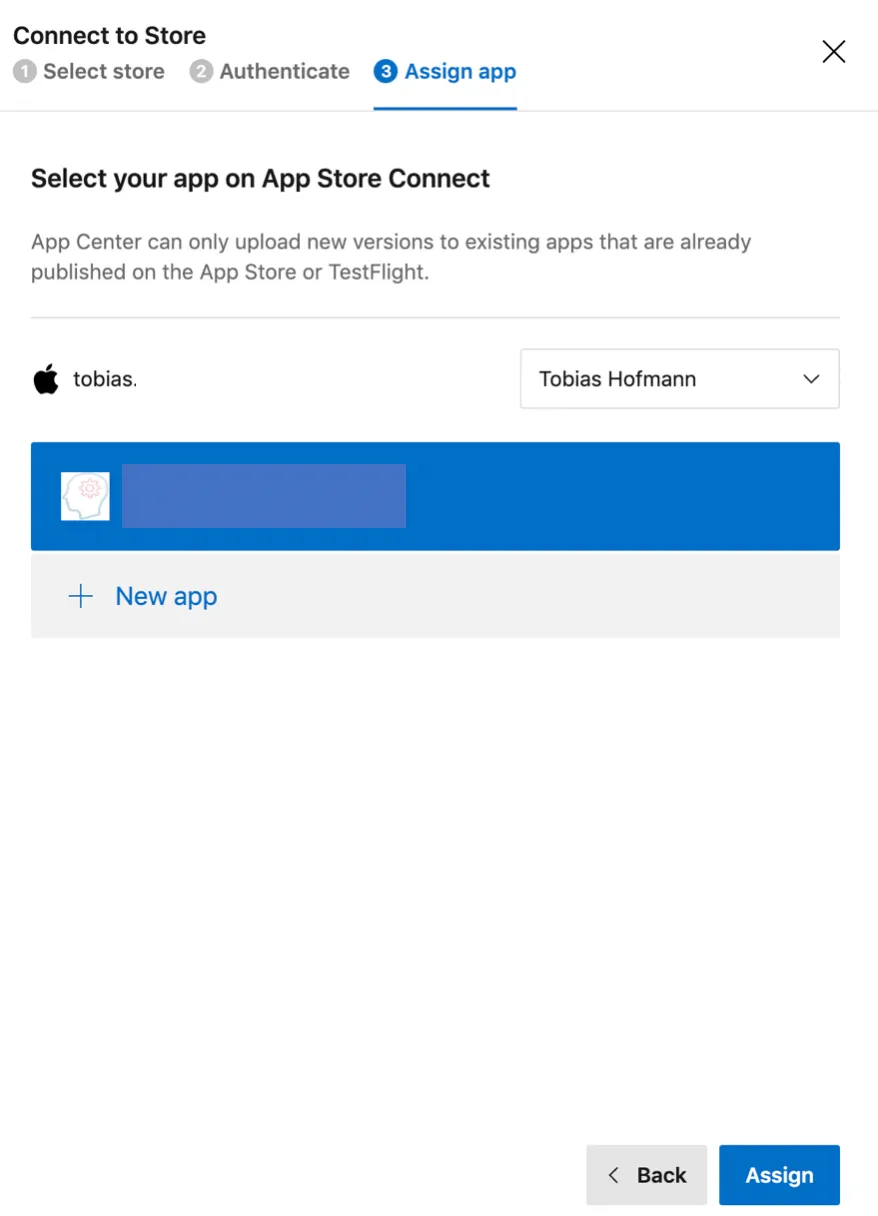 AppCenter is connecting to App Store Connect and retrieves a list of apps. I only have one app available, making the selection easier. It also means that you have to create the app first in App Store Connect. AppCenter is not able to create the app definition for you.