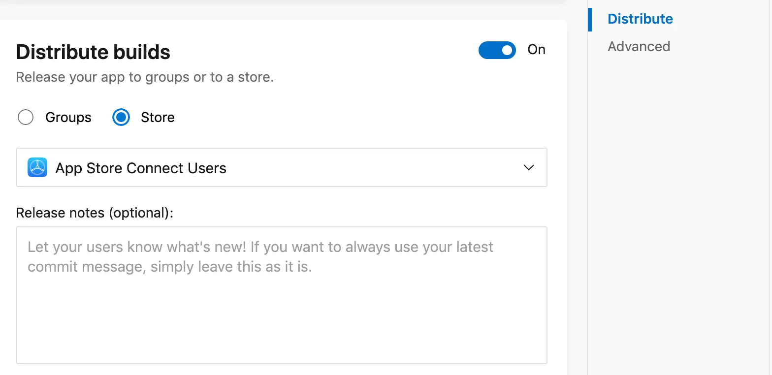 Now AppCenter is configured to connect to Apple Connect. Back at the Distribute builds section, you can select App Store Connect Users.