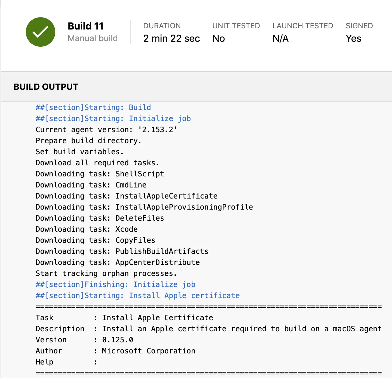After the project is created and the build configured, you can start a build. AppCenter will find an available build agent, clone the repository, build, test, sign and distribute the app.