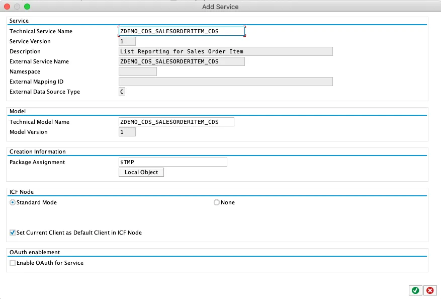 The above created a CDS Data Definition and when activating, some magic happened. What is missing is to activate the OData service. ADT won’t do this for you, this needs to be done manually in the Gateway System.