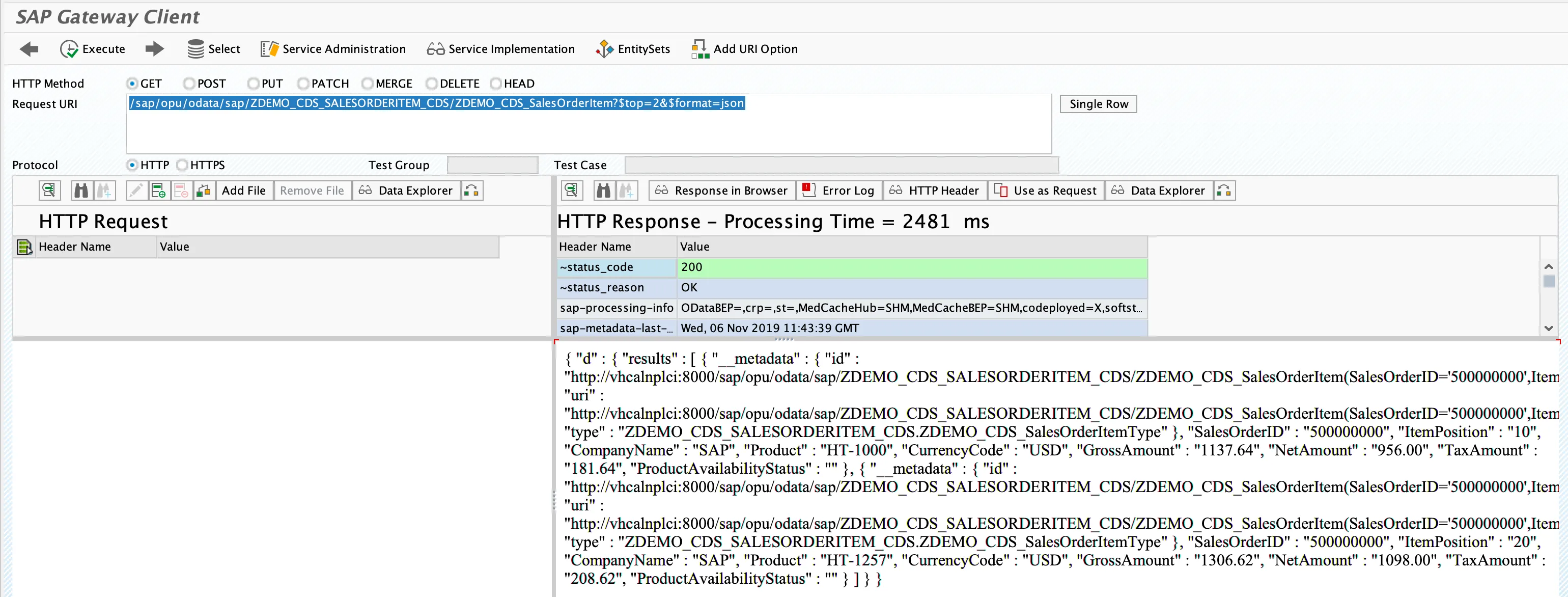 /sap/opu/odata/sap/ZDEMO_CDS_SALESORDERITEM_CDS/ZDEMO_CDS_SalesOrderItem?$top=2&$format=json