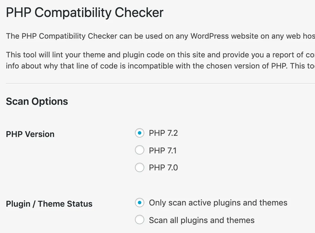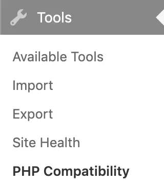 The PHP Compatibility plugin is started from the WP Admin site. Hint: in my case, the plugin worked fine, but also crashed the server. After running it and saving the results, uninstall it.