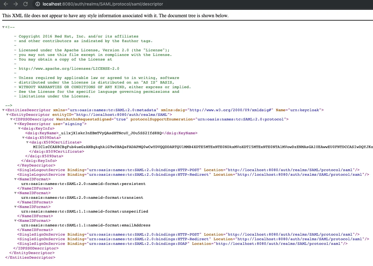 <EntityDescriptor entityID="http://localhost:8080/auth/realms/SAML">