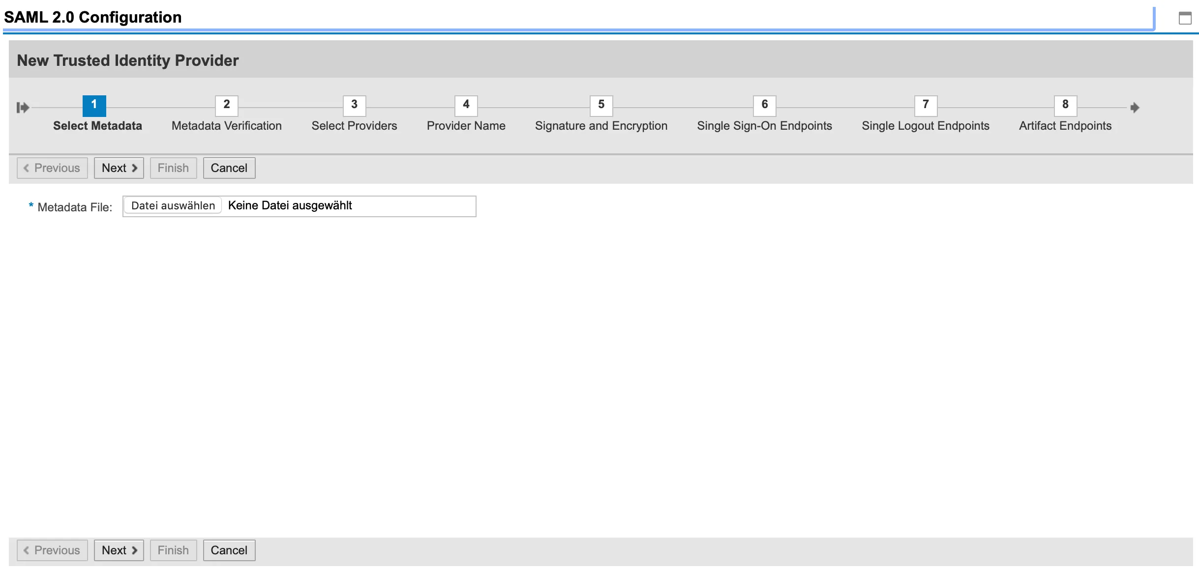 Import the previously from Keycloak downloaded SAML 2.0 IdP Metadata file to NW ABAP.