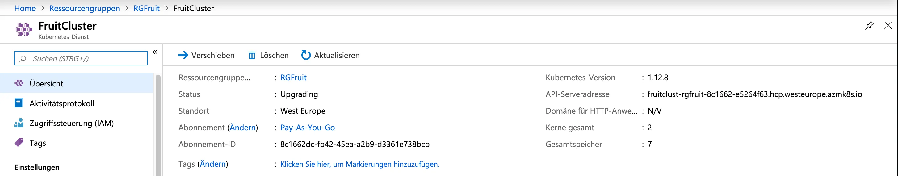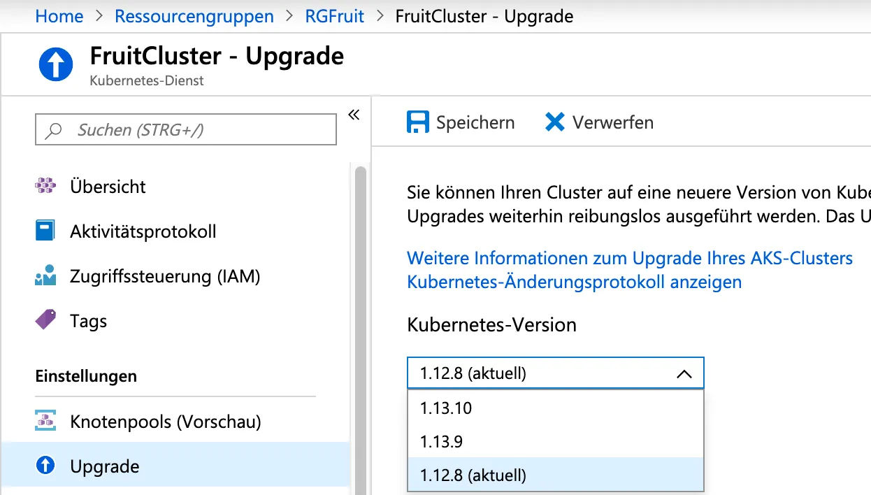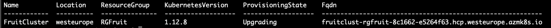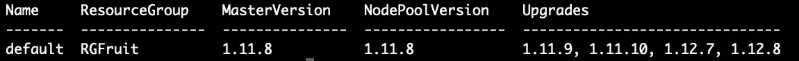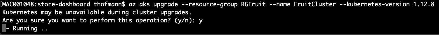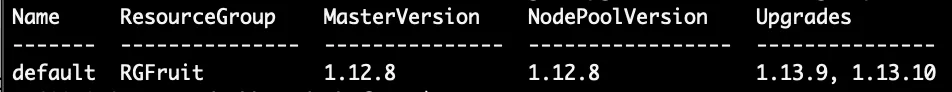 az aks upgrade --resource-group RGFruit --name FruitCluster --kubernetes-version 1.12.8