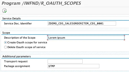 For each OData service you want to access through OAuth, a unique scope 🔗 is needed. The scope is based on the OData service. The scope is needed to know if the client can access the resource provided by the scope. The scope is assigned to a user through an authorization profile (security object S_SCOPE). Before you can assign the scope to a user, you must know the scope of the OData service.