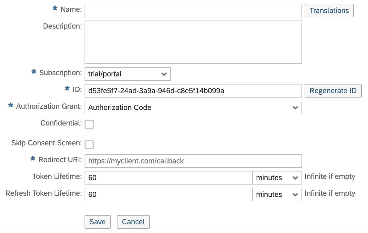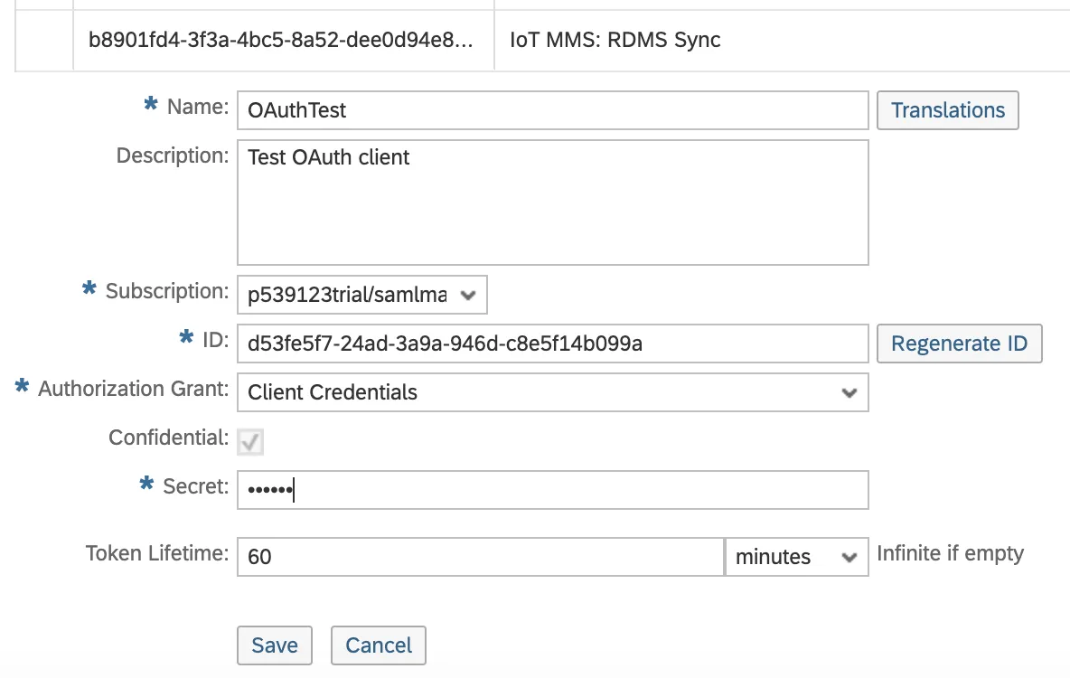 The form is activated and some values are already filled out. Some values must be changed when adding an OAuth client with client credentials.
