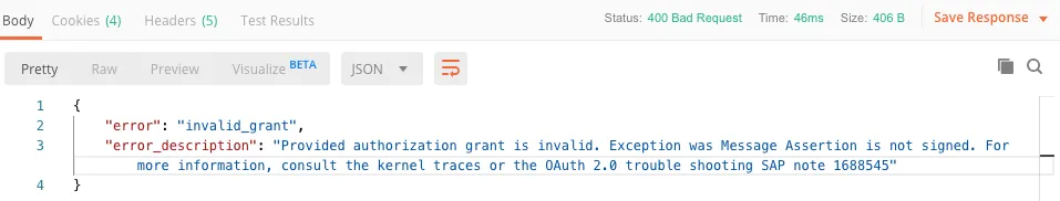 "error_description": "Provided authorization grant is invalid. Exception was Message Assertion is not signed. For more information, consult the kernel traces or the OAuth 2.0 trouble shooting SAP note 1688545"