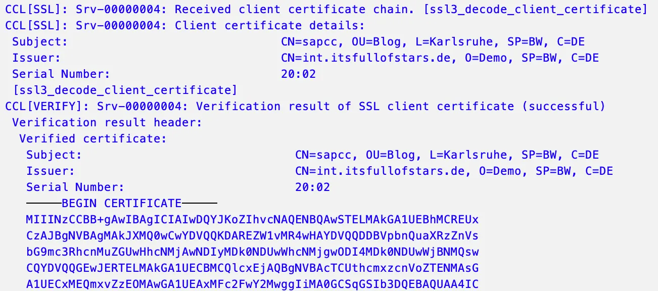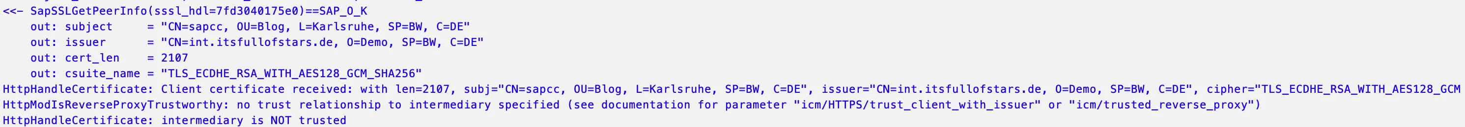 The error message includes how to fix the problem: “icm/HTTPS/trust_client_with_issuer” or “icm/trusted_reverse_proxy”. For how to configure NW ABAP ICM for this, see my blog X.509 troubleshooting – Send X.509 Certificate in HTTP Header 🔗.