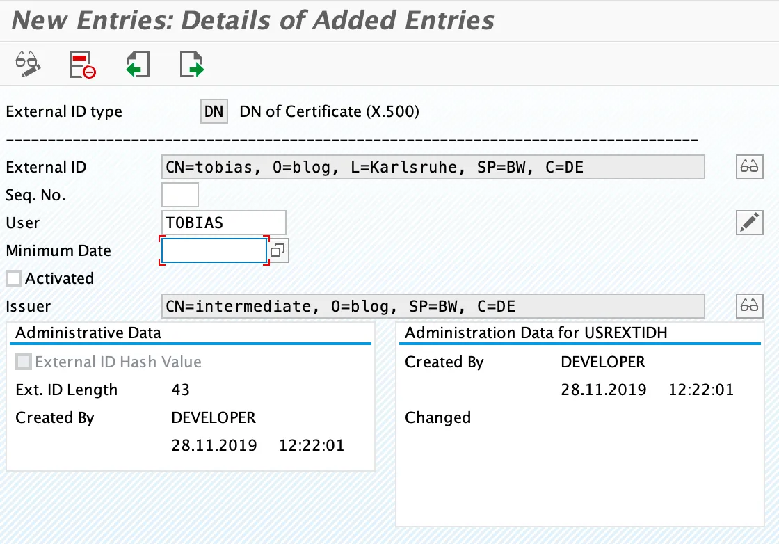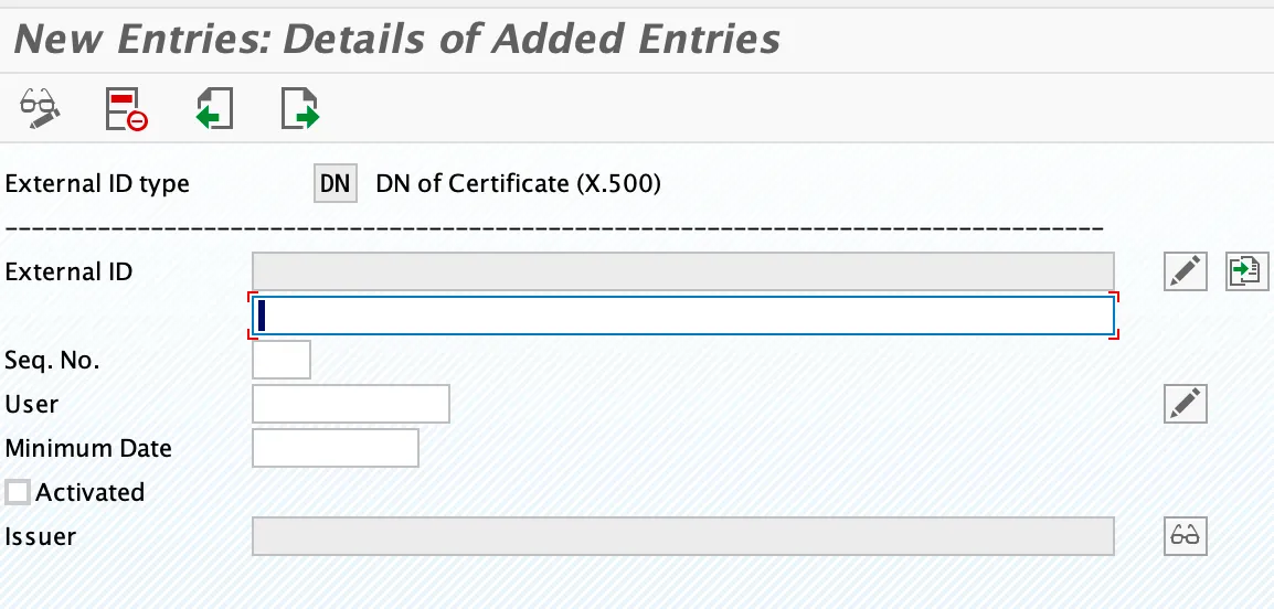 A new entry for external Id is added by inserting the CN information the certificate has in its Subject line.
