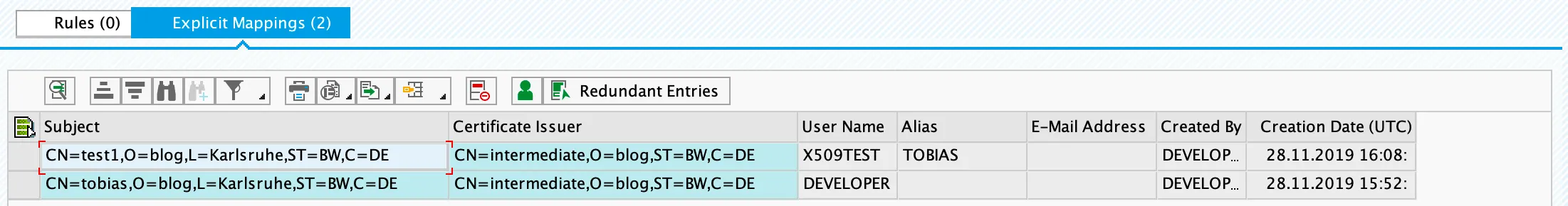 Click on explicit mapping to assign a specific SAP user. In this example, I’ll map the CN test1 to SAP user X509Test.