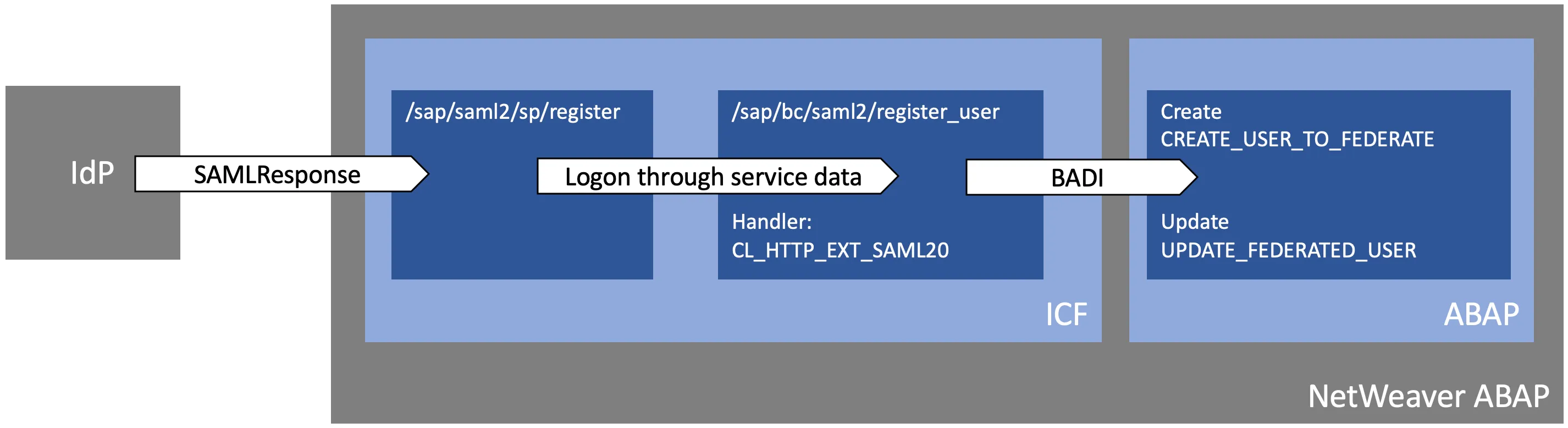 The ICF configuration is more complex than the standard SAML 2.0 configuration. Instead of just validating the SAML 2.0 response, the response must be validated, and a user created or update. To be able to create / update a user, the response received must be handled by a service user. That user has the permission to create / update the user in the NW user base. Therefore, the SAML 2.0 endpoint is not the standard ACS endpoint. An external alias is used to receive the SAML response from the IdP, here the BADI is called, and then the user is redirected to the original service URL.