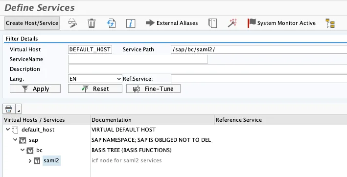 Select the host, service path /sap/bc/saml2/ and click on “Create Host/Service”.
