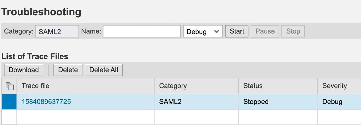 With the tool you can start a SAML2 trace. When the trace starts it logs all related log files and makes them accessible in a table. Stopping the trace will save it and you can access it later for further references.