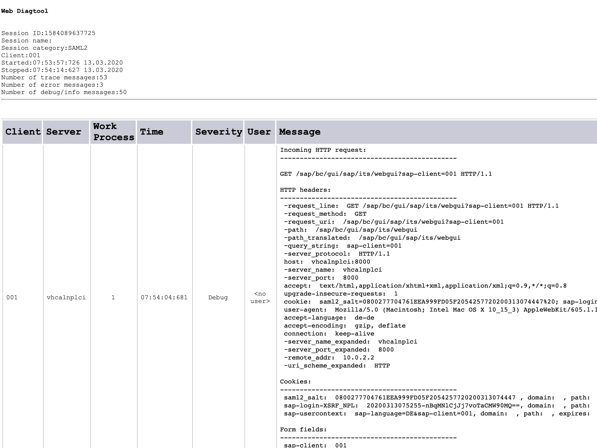 The tools logs a lot of SAML2 related information. You can see the HTTP information and headers, cookies, etc. As well as thrown ABAP error messages. This is the recommended tool to troubleshoot any SAML 2.0 related issues.