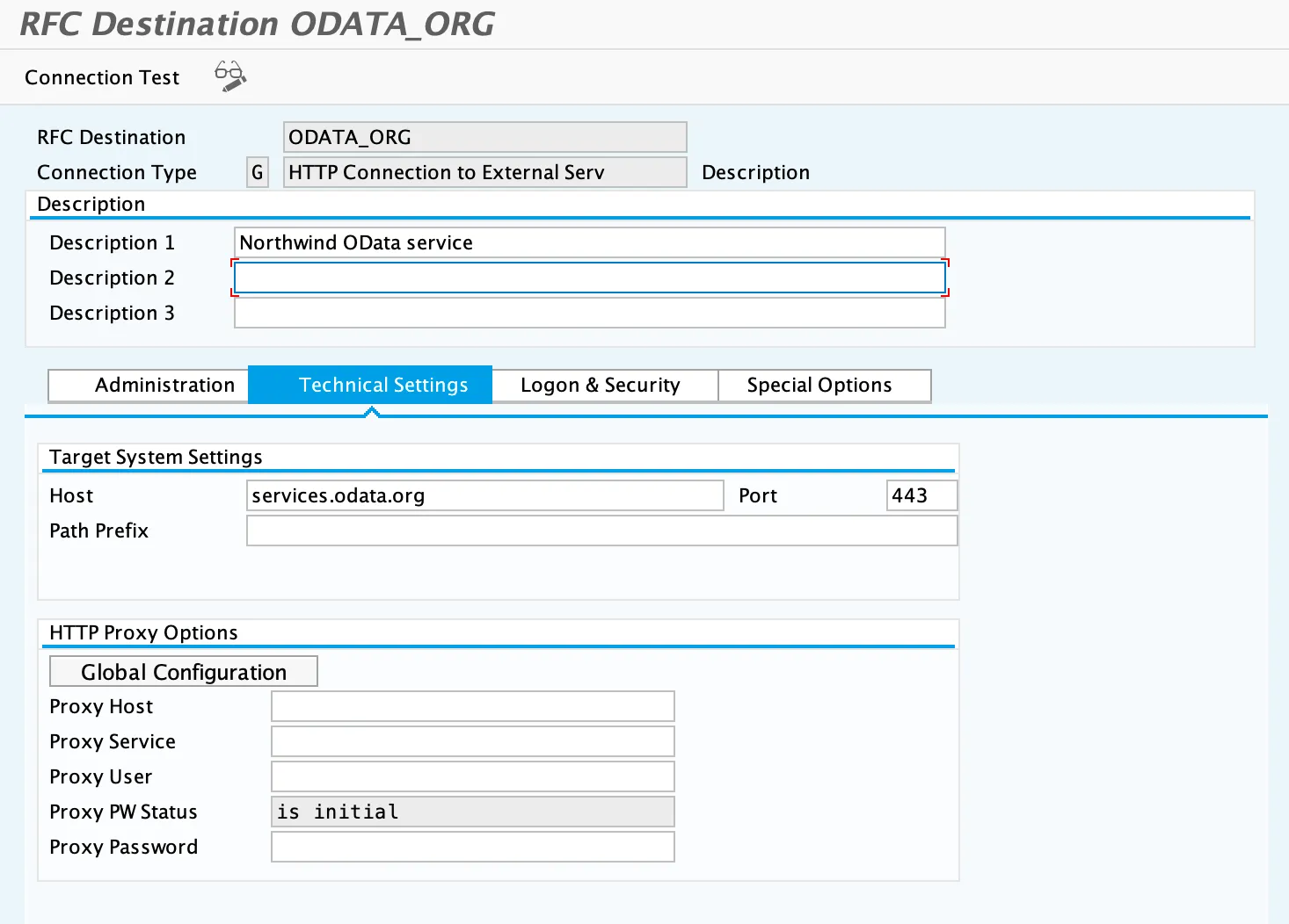 To be able to connect from NetWeaver ABAP to the external OData service via HTTPS, a connection must be created. This is done in transaction SM59.