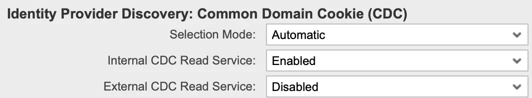 In the section “Identity Provider Discovery: Common Domain Cookie (CDC)” the parameter “Selection Mode” defines if the user is automatically redirected to a IdP. By default, the value is set to “Manual”. This means that the user needs to select an IdP. To let the SP select an IdP automatically, change the value to “Automatic”.