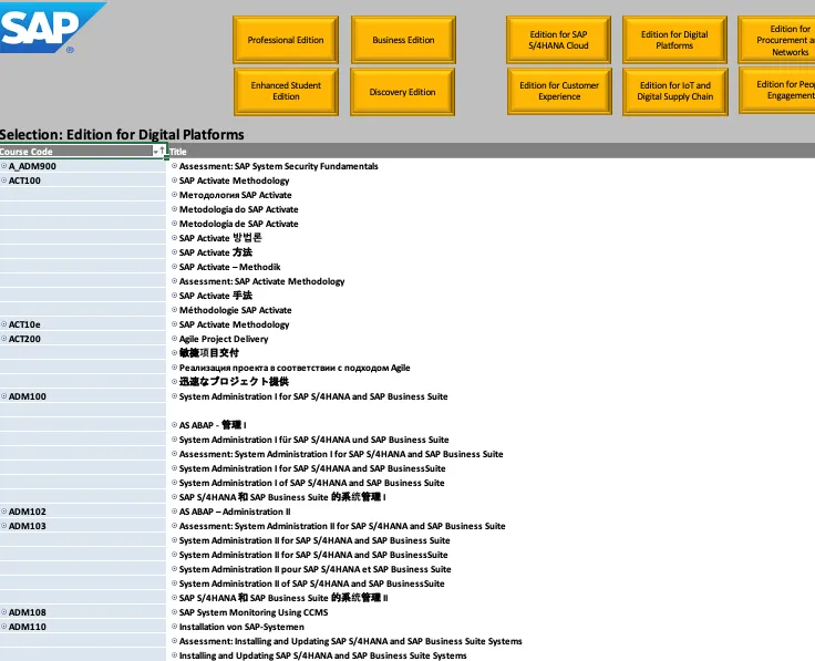 Point 1) is unforgivable. SAP has the tools to provide a list of their trainings as a web app (CAP/Nodejs and Fiori Elements come to my mind). Download of a macro enabled Excel file to be able to get a list of trainings? That’s not state of the art in 2021. For 2) and 3), I guess many people want to find a training and already know what they need. The flow break between a learning journey and LH edition seems artificial: great you found a course, now start from scratch and try to find a LH edition that matches. And while there are many LH editions available to choose from, most contain useless content if you are interested in the content of a learning journey. If I want to learn how to develop ABAP on HANA 🔗, the learning journey tells me I should attend 3 trainings: HA300, HA400, BC404. That’s all I need. But do I get a LH edition with just these 3 trainings? For Fiori 🔗, it is UX100, UX402, UX403, UX410. Of course, there is not LH edition tailored for Fiori developers (not that we need one for UI5, given the superb SDK documentation). Or BTP architects, developers, etc. Or take Microsoft Learn as a role model and just offer the content for free and charge only for instructor-led trainings.