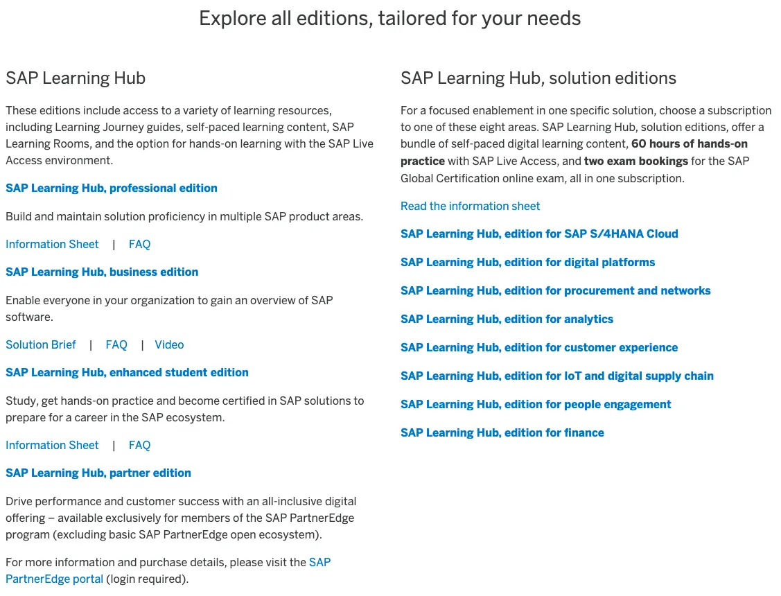Recently I was searching for a training on SAP topics. I found some learning journeys 🔗 which I think are a good approach in making the available content findable. A journey points you pretty fast to SAP Education as most training content referenced is paid content. I decided to review the offering and see what options are available. On the SAP Education website 🔗 you find a link to SAP Learning Hub (LH) that lists the available LH editions to choose from.
