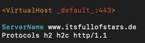 Base configuration 🔗 for Apache 2 to activate HTTP/2 is to load the module and adjust the configuration to activate http/2. After Apache is ready the correct PHP engine must be activated. Then WordPress will be accessed via http/2.