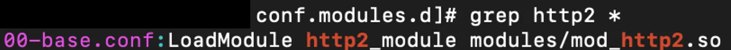 To be able to use the http2 module, load and activate it in the Apache configuration. In my case, the config file is: 00-base.conf. Add or uncomment the line: