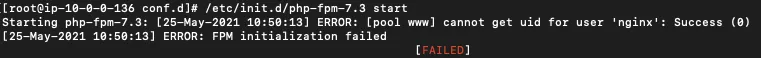 If it fails, check the error message. In the above case, the user nginx cannot retrieved. The server is running Apache2 and not NGINX, therefore no nginx user exists in the system.