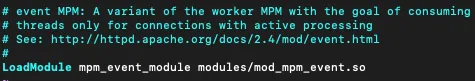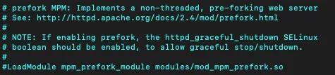 Deactivate the mpm module. Comment out the MPM Prefork module