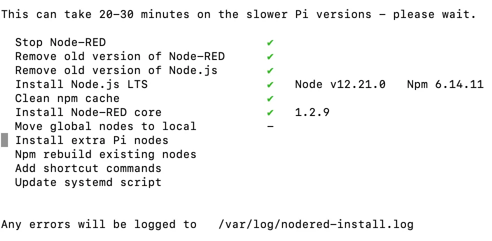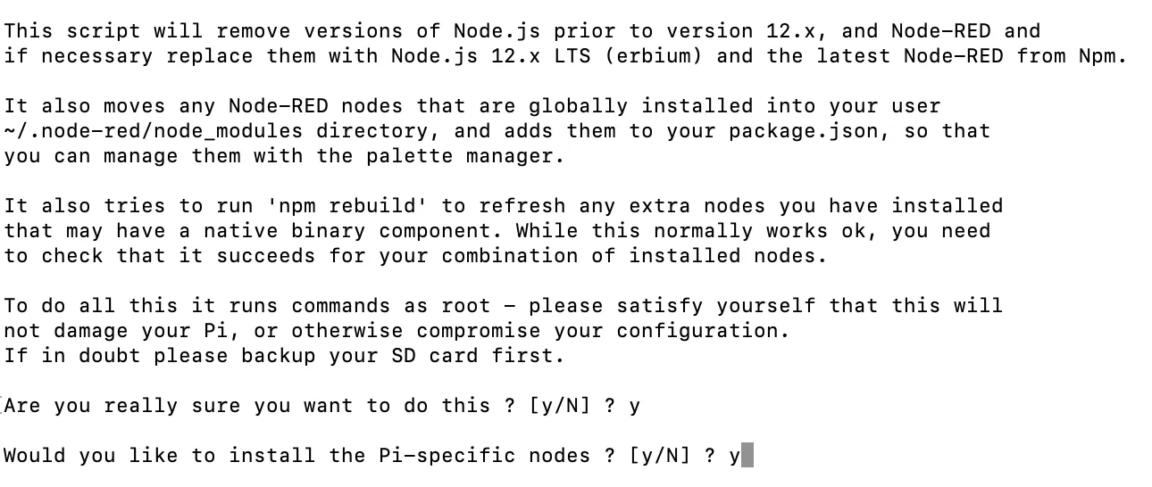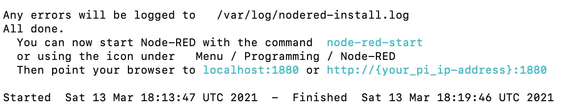 The Node-RED project offers a nice documentation on how to install it on a Raspberry Pi 🔗. Installation is done by downloading a convenience script from the internet. You have to trust (or check) the script. The script will run as root, so take care!