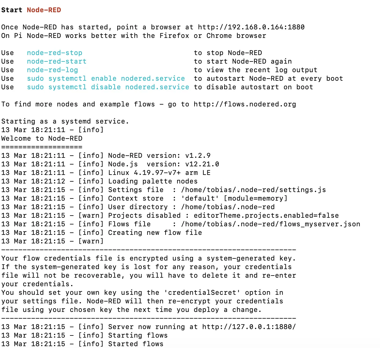 Node-RED is accessed via its web interface. When starting Node-RED, the address to use is shown in the output. The IP of my RP is 192.168.0.164 and port 1880: