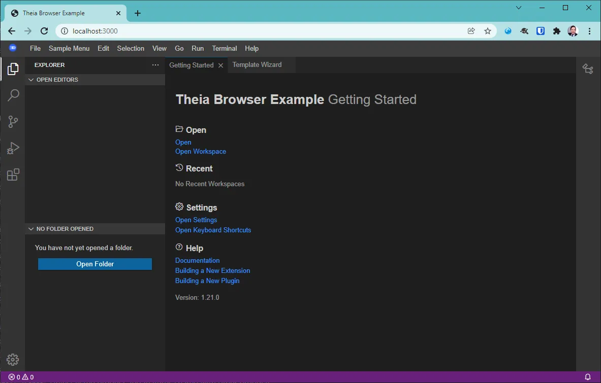 You build your own Theia from source. This sounds more frightening than it is. For now, it is just to be able to access Theia running locally. No additional plugins or standalone app. With the source code cloned, all it takes is a few yarn commands.