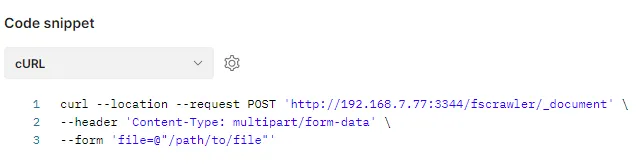 Nothing else is needed to send a single file. The code snippet for curl reveals that the request matches the FSCrawler documentation.
