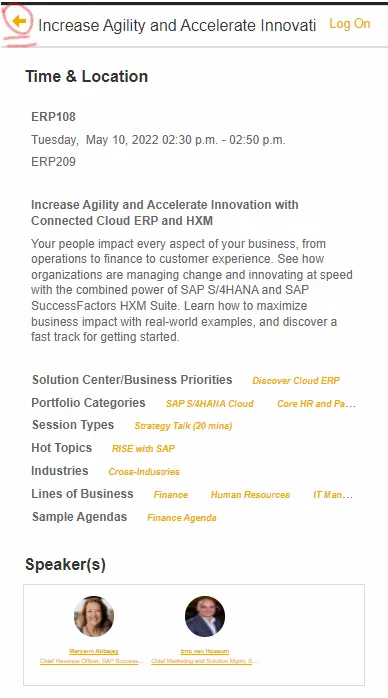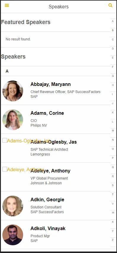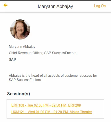 From the speaker directory, you can select a speaker to get details and the sessions of that speaker.