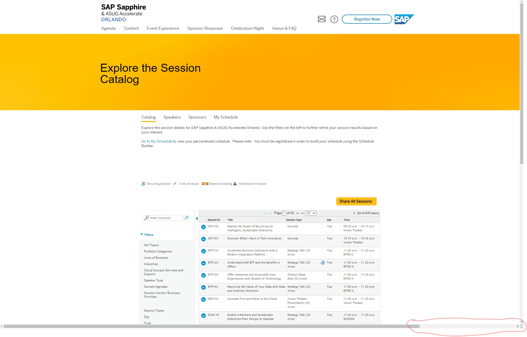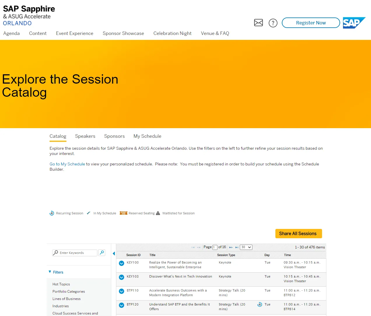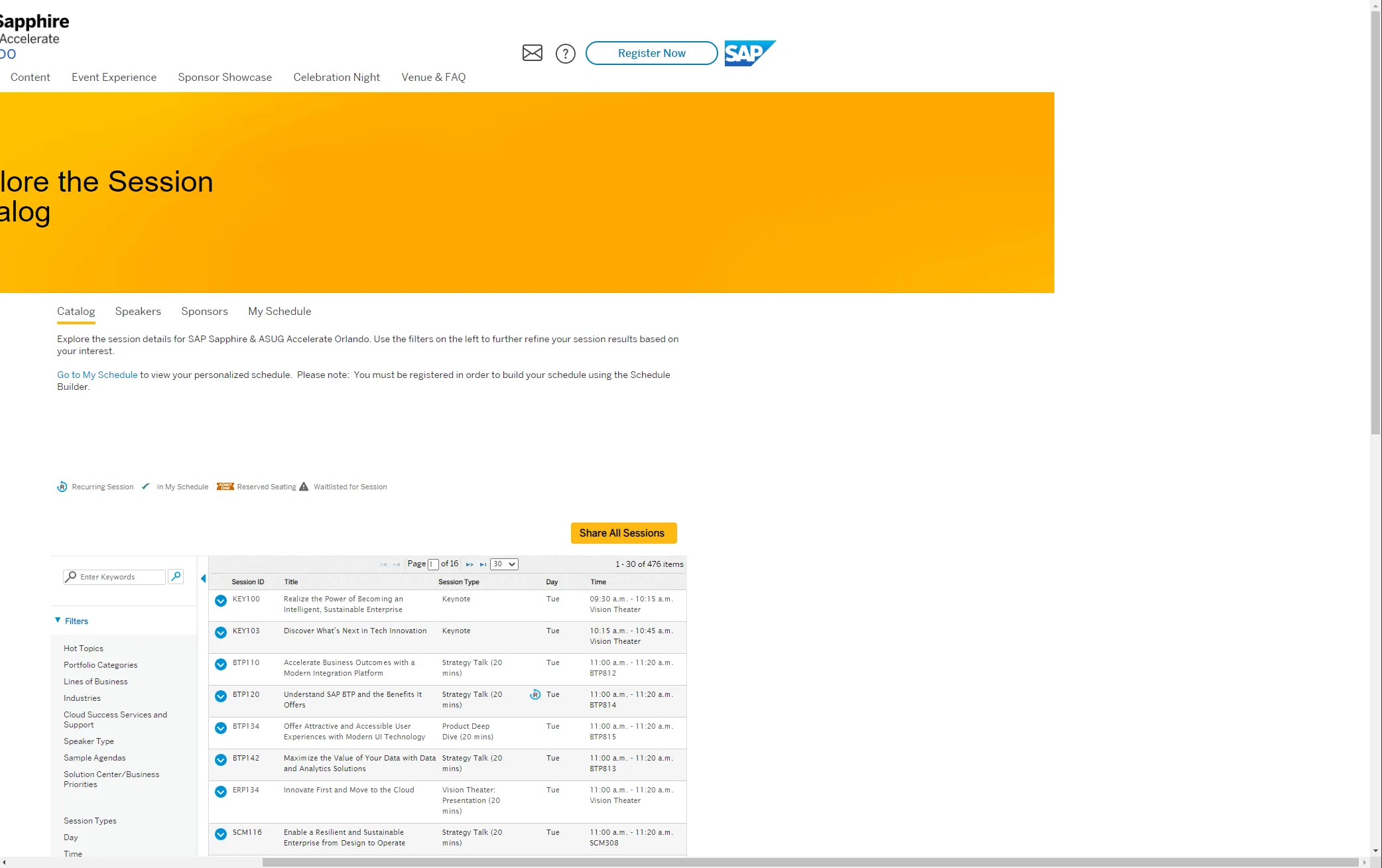 While there is a tab named “Content”, you do not find the sessions under it. In fact, the session catalog can be found via an additional click on “Go To Session Catalog and Schedule Builder”.