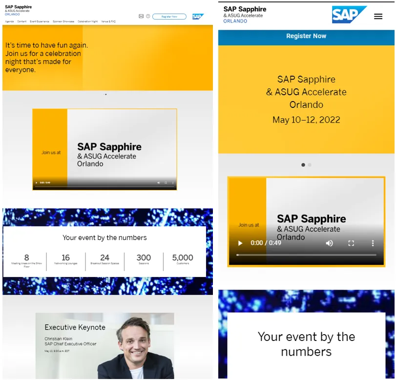 SAP’s Sapphire starts May 10th 🔗. A few days before the official event start the event page is made available. I have written several event sites / apps in the last years, so I can relate to the effort and difficulties involved in creating such an app. I also find it interesting to see how common problems are solved and how content is presented. My latest endeavor in that regard was ABAPConf 🔗. Also, for the ABAPConf 2021 event site / app I received comments from SAP employees like: nice, but ugly, don’t you want to use a professional service for this? (Short: We are used better.) Funny as I know that SAP constantly fails to deliver a high-quality event app. So I decided to wait for the next big SAP event and capture the quality delivered by SAP so next time I can refer people to this post when it comes to the quality of my own event apps. And that a team of professionals with the support of a multibillion dollar company don’t necessarily deliver a better event app than someone that does it for free, in spare time, in the evening and weekend. Let’s take a closer look at the event site for Sapphire 2022.