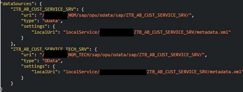 The service name was the same: ZTB_AB_CUST_SERVICE_SRV. The path was different: NGM vs. NGM_TECH. This is how this looked in the file manifest.json: