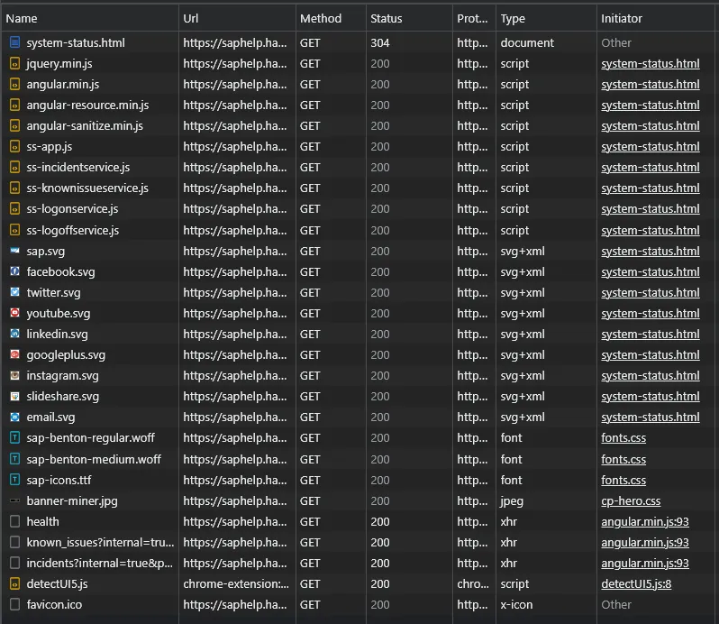 That’s all nice, but honestly, that is how a real world website works. If it works, don’t touch it, and who is constantly updating the libraries and source code? What is more interesting is how the site is working. Its purpose is after all to report the status of the SAP Help portal. This is done by polling the system status.
