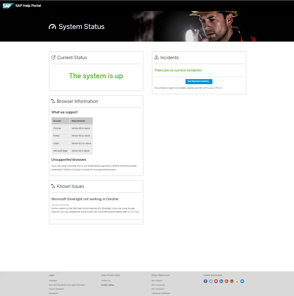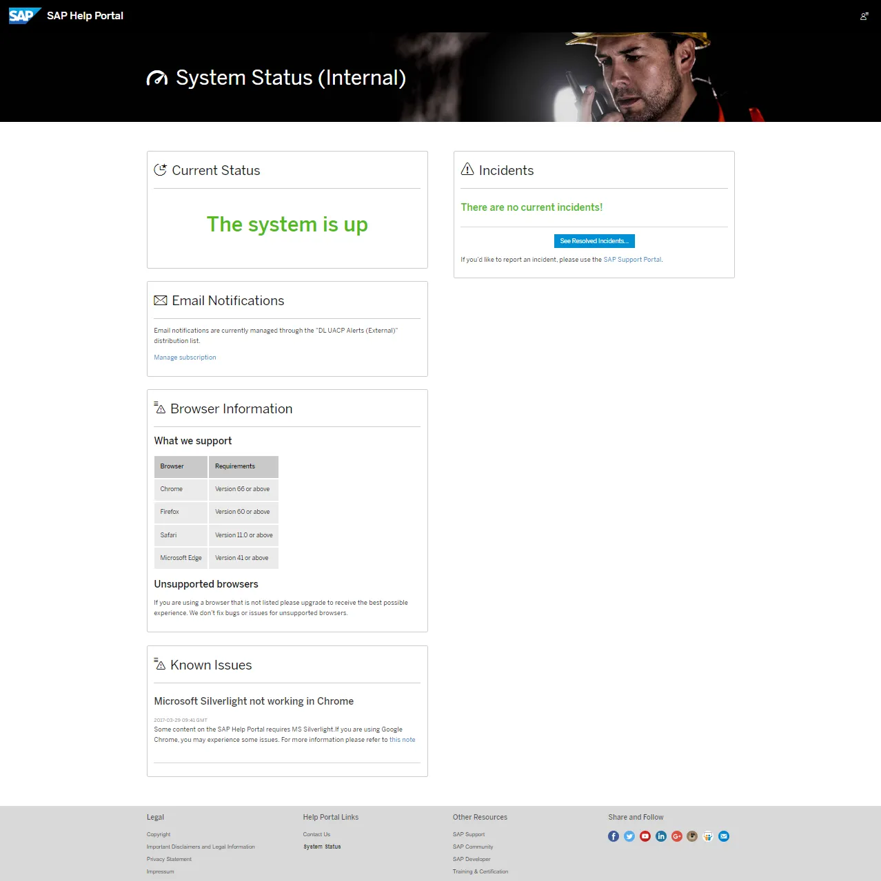 It is a nice footer with a lot of information (ignore the link titled Cookie-Präferenzen that for whatever reason is shown in German, while all other texts are in English). What surprised me was the link System Status. Did you know that there is a system status site for SAP Help available?