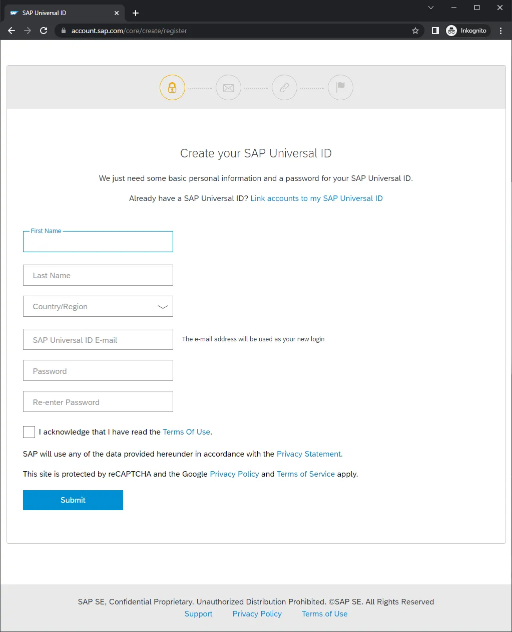 This time the site contains links to privacy policy 🔗. It links to the privacy policy specific to SAP Universal ID, not the one you find on other SAP sites like sap.com 🔗. What I did not get again was: