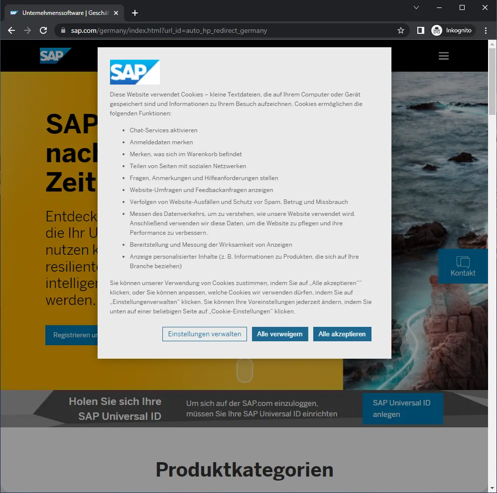 Accessing sap.com 🔗 I get the usual cookie notice and a very comprehensive privacy policy. The dialog explains me in the settings the necessary and technically mandatory cookies and why they are needed. Like: technically mandatory, reason: to be able to log in. The data privacy 🔗 contains a link to the cookie statement 🔗.