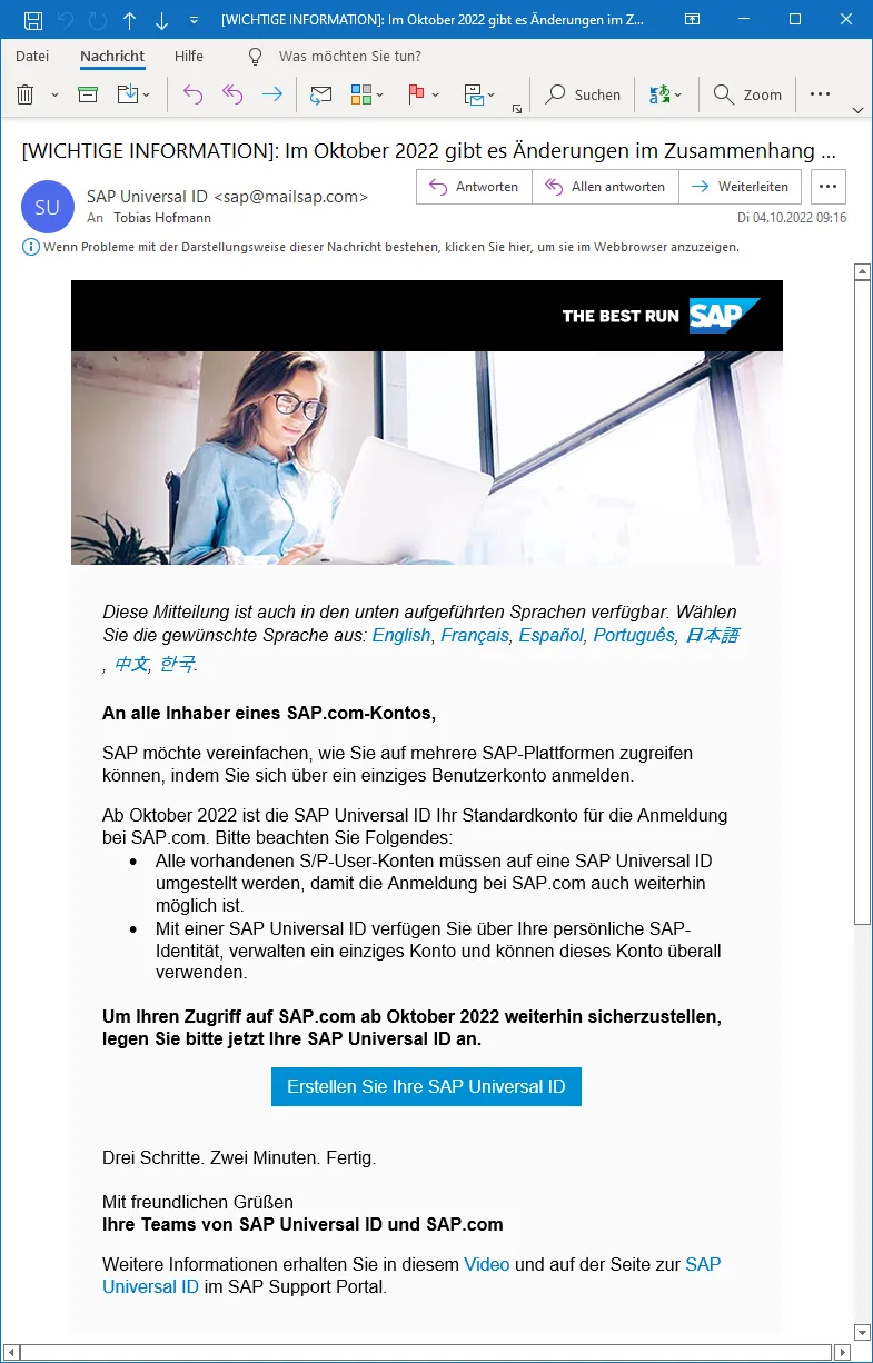 SAP sent out in October an e-mail informing S/P-Users that you need to upgrade your account to an SAP Universal ID. I do not know how many people received this e-mail, but I guess it was not just me.