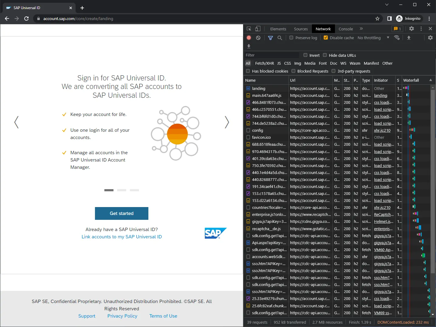 Regarding resource loading, everything is loaded from the same server: accounts.sap.com.