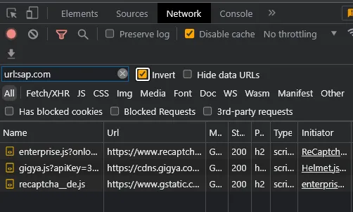 Gigya belongs to SAP, but gstatic.com is Google. This is because the site uses ReCaptcha. For the Germans reading this article, you may have heard about a Google Font problem 🔗. ReCaptcha is JavaScript and not a font, maybe the “individuelles Unwohlsein” still applies (that’s the German courts contribution to the internet). Seems SAP found a way to load data from Google on page access and still be not affected by the court decision about giving away private data (IP address). If so, I think everyone that runs a web site that loads data from e.g. Google is interested to hear how SAP achieved this. Is it because to be able to use ReCaptcha this is the only way, while for fonts you can host some locally?
