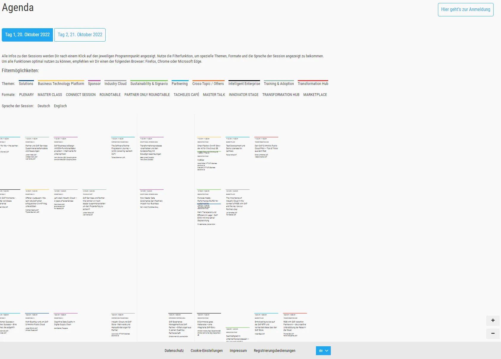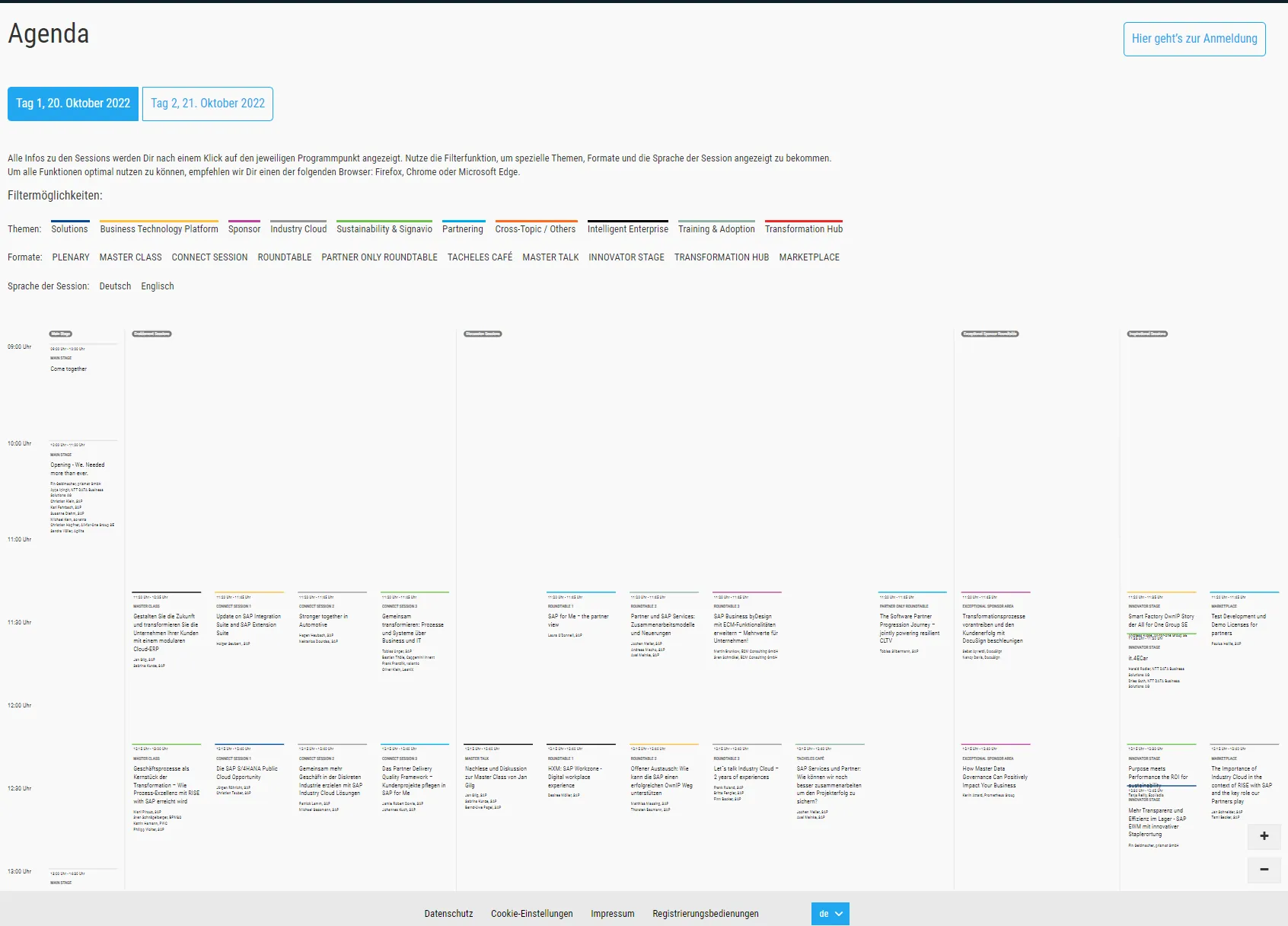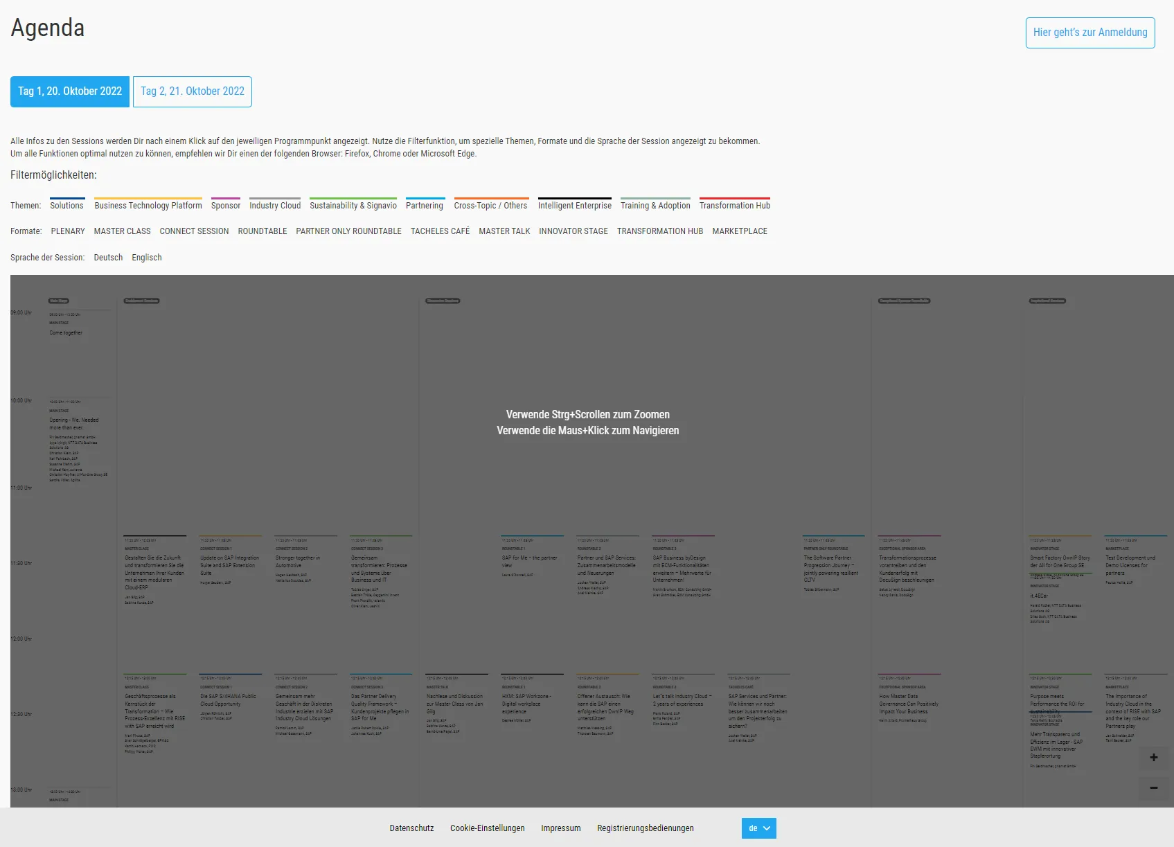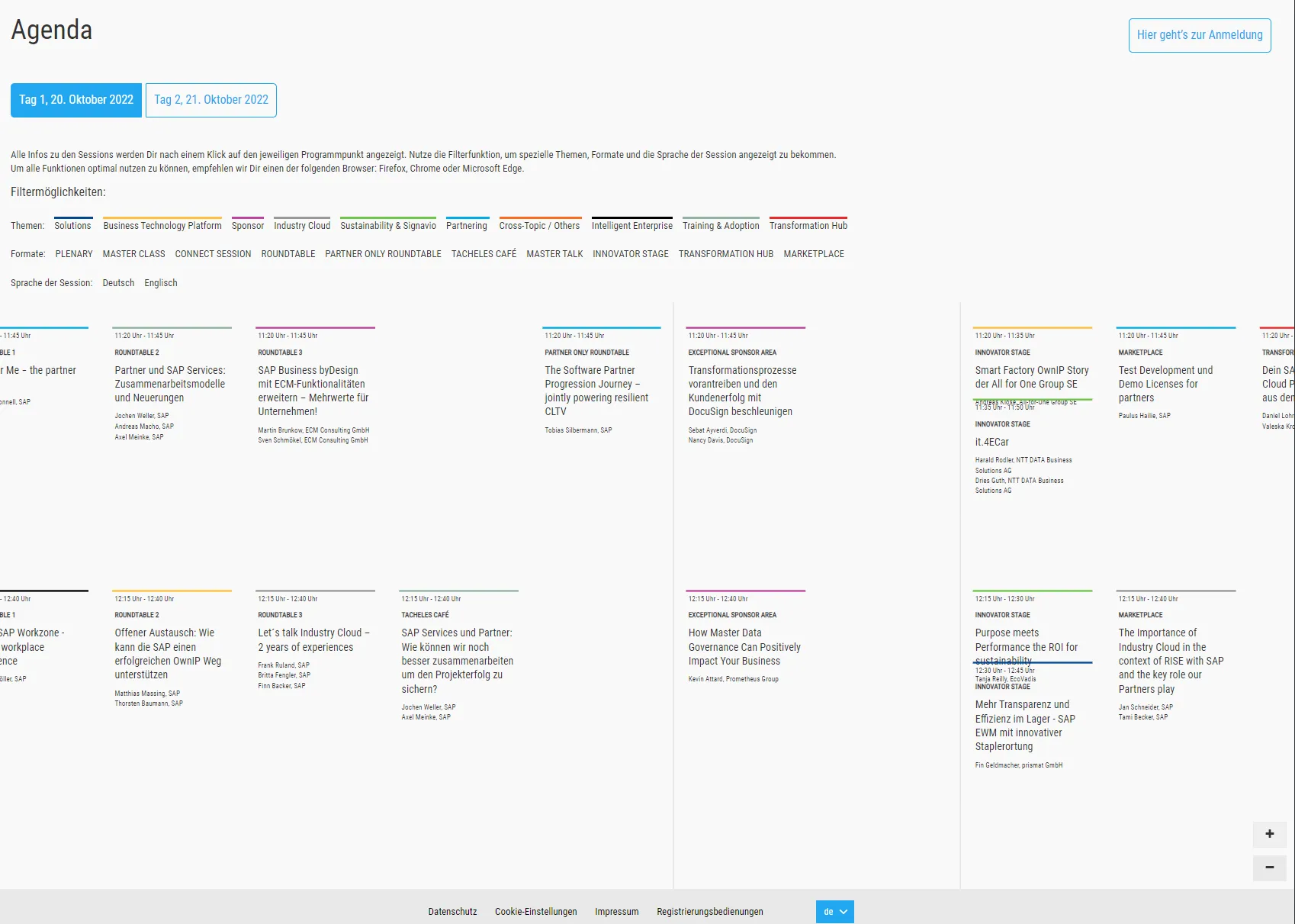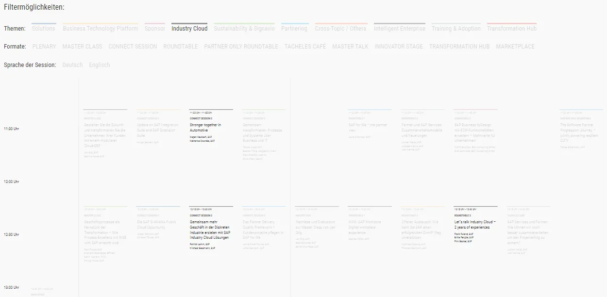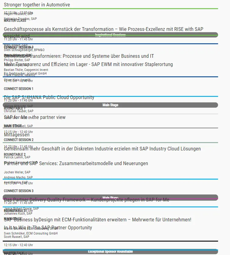 The agenda is some breathtaking experience. There are many ways how to present an agenda on a web site. It is very, very complex topic. With several tracks in parallel, it is a challenge. The approach many adopted is to not show a simple overview at all and let the user have to select the sessions. The drawback is that a person is not able to see which session run in parallel. It is always better not treating your audience as twits and let them see what is happening at the event. There are many good approaches, some are great, some not. The perfect solutions does not exist. Yet, for the approach used for the SAP Connect agenda I think it is safe to say: it only can get better.
