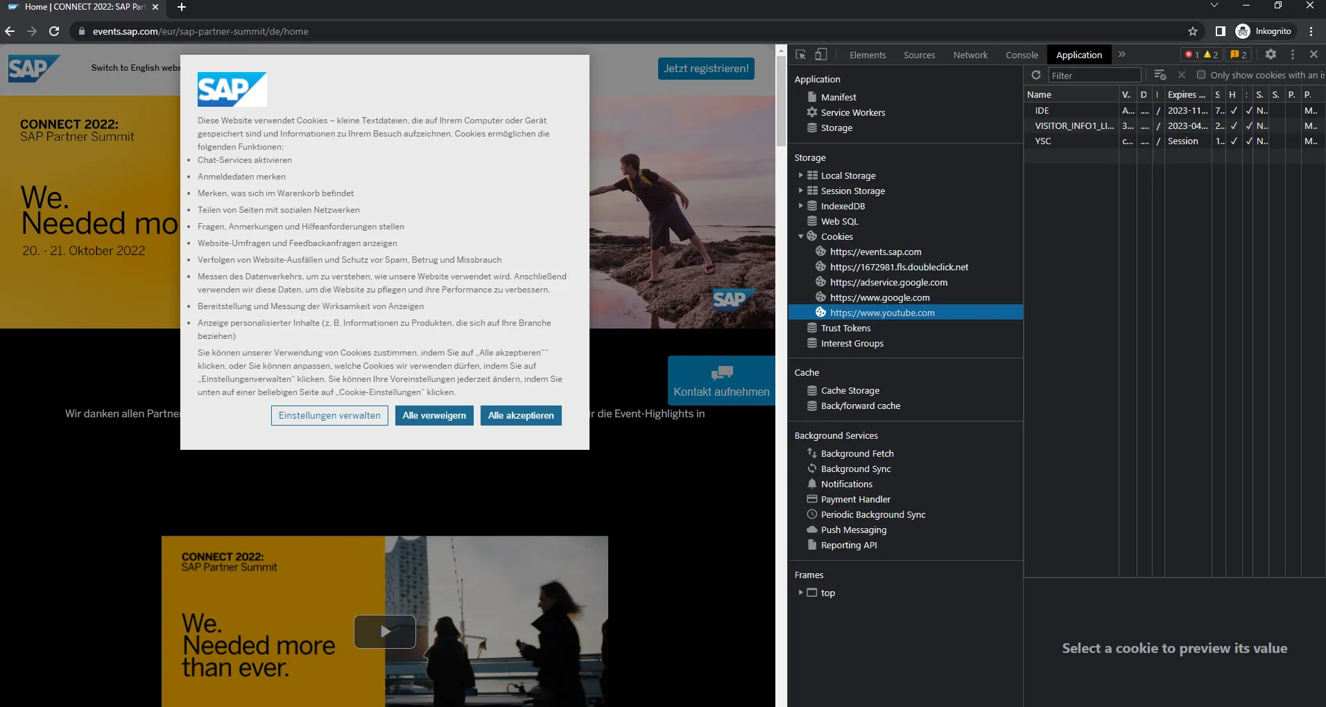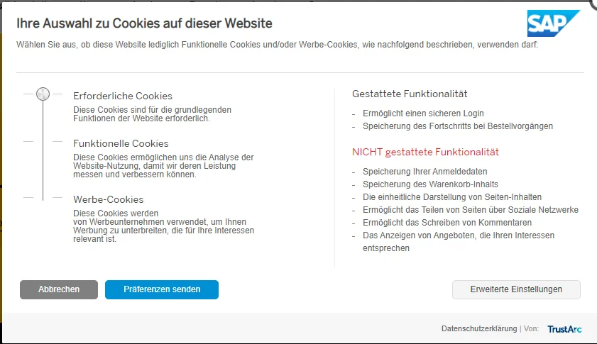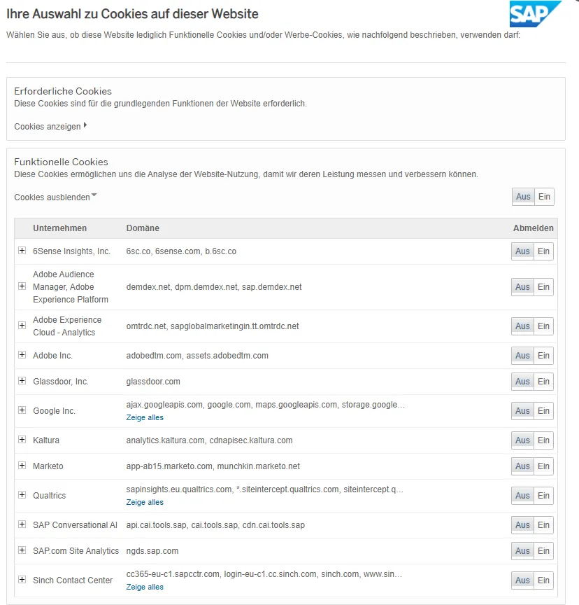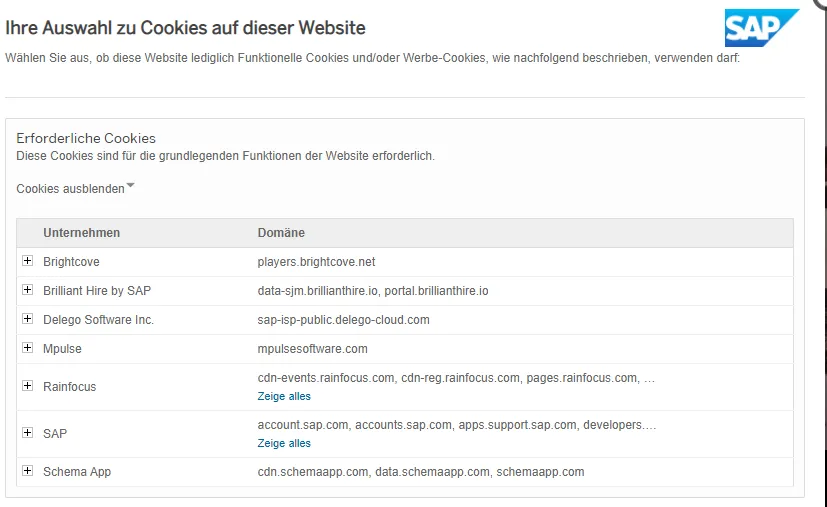 It is a really, really good cookie consent configuration SAP offers here. It also lists the necessary cookies and the domains they are loaded from.
