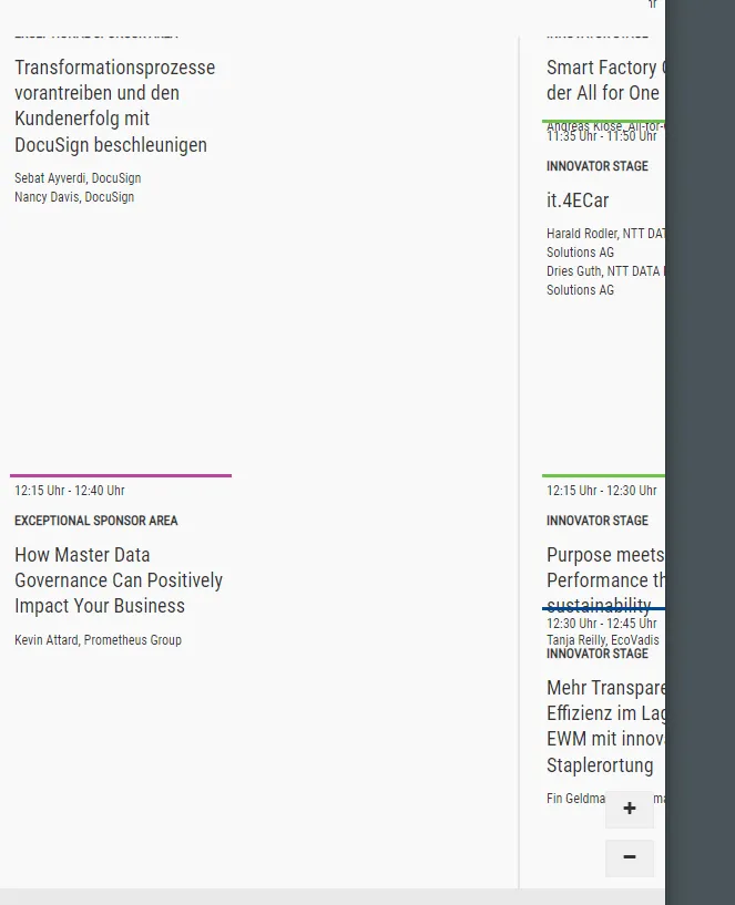 The agenda is better on the app. We reached the bottom with the agenda in the browser, of course it must be better. Reading the session track title is still not easy for the eyes, but better. I guess the agenda was made for mobile usage, and maybe only tested and demonstrated on a mobile device.