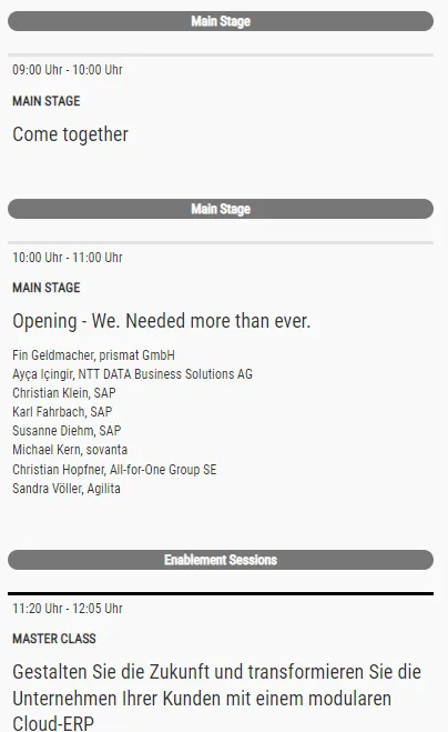 Note: a session type is master class / master talks. Inclusive language is a topic at SAP, also made clear by Thomas Saueressig at his DSAG JK presentation. There is an SAP Help site about this topic 🔗. And here master class is listed as acceptable 🔗: “When referring to skills and proficiency”. But why don’t just substitute master with expert?
