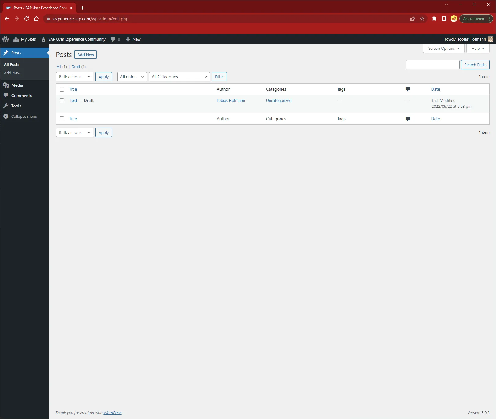 The possible actions assigned to me where somewhat limited but showed that I was logged in as a valid user with the permission to work with articles. For publishing articles, a work flow is in place. While creating a post was possible, to be published it must be approved. Something I did not try out.